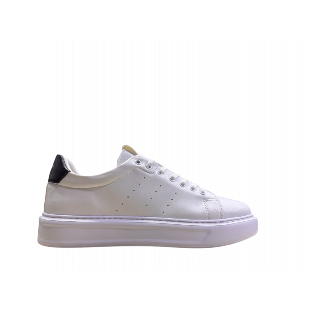 Ανδρικό λευκό sneaker κατασκευασμένο από ec0 leather (τεχνόδερμα) .Έχει ενιαία , μονοκόμματι σόλα , είναι λευκό με μαύρη λεπτομέρεια στο πίσω μέρος . Ένα key- item που μπορείτε να συνδυάσετε με jeans , λινά ακόμη και με το κοστούμι σας .