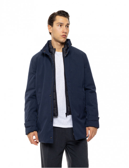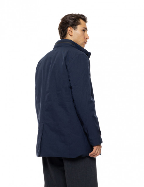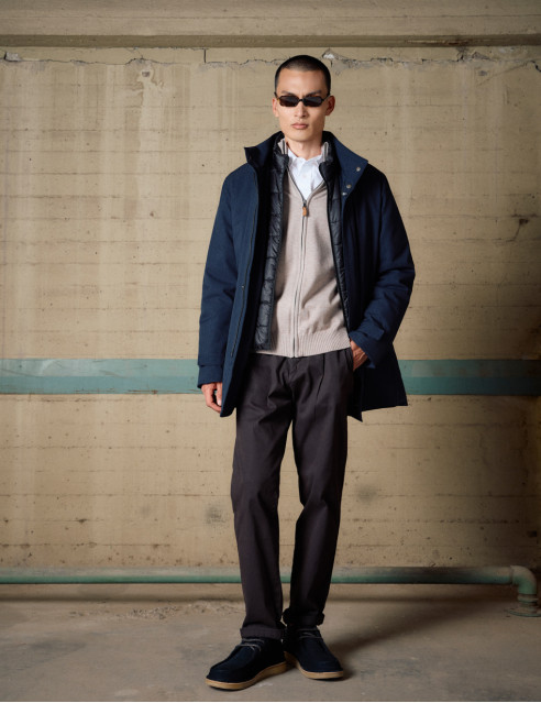 Ανδρικό μπουφάν χωρίς μεγάλο όγκο σε μήκος jacket (κάτω από τους γοφούς). Ζεστό , άνετο με όρθιο γιακά και εσωτερική μόστρα που κουμπώνει ξεχωριστά. Ένας συνδυασμός μπουφάν και παλτό αφού το εξωτερικό του ύφασμα έχει βαμβακερή υφή .Ένα πανωφόρι για πολλαπλές χρήσεις .