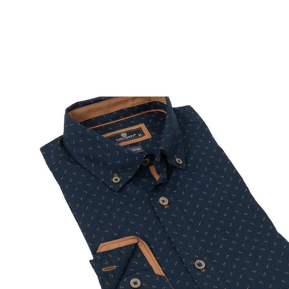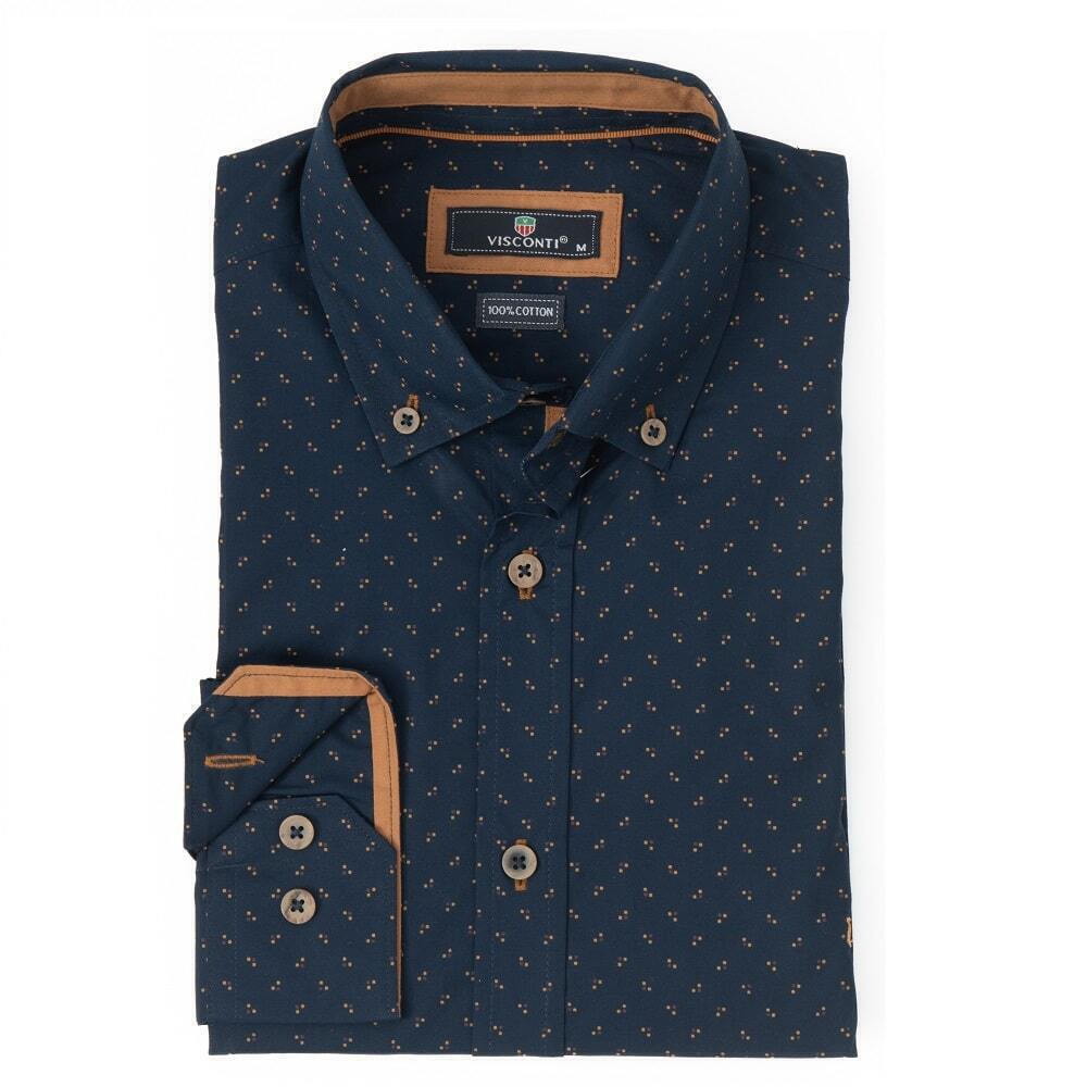 Πουκάμισο μακρυμάνικο ,σε σκούρο μπλε χρώμα με μπεζ μικροσχέδιο . Συνδυασμένο άρτια με καφέ κουμπιά στο εμπρός μέρος δίνει μια σύγχρονη αίσθηση χωρίς υπερβολές.